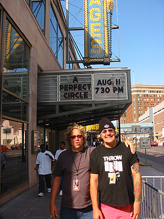 Let it be known throughout the land (or at least Independence, Missouri) that Shepherd and Danny can kick anyone's ass at Foosball. Anyone's ASS ASS ASS! The Piggies partied with the Mo. Folkers then went back to Denver and scared the mascara off the Goth people attending the Typo-O-Negative show at the Ogden. Those Type-O boys have more hair than ol' Forrest has ever encountered---I hear they keep cases of Draino onboard their bus to keep the plumbing pipes clear at all times. Imagine what they spend shampoo and conditioner. Frightening. The following week found the fellows' back in LA for some much needed R & R but they were on a plane to Portland, Oregon early, early the following Monday morn for a show at Berbotti's Pan that night and Studio 7 in Seattle on Tuesday. Wednesday will find the Circus back with A Perfect Circle in Vancouver for the kickoff of the Canadian leg of the coolest tour of the millennium. So, lets all lift a Molson Ale, eh, and wish the travelers' beauty times an' stuff, eh. Your humble narrator will try his darned-est to keep you folks up to date. ... Forrest Groat